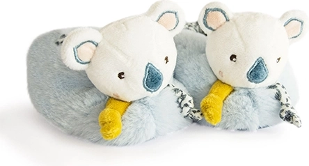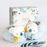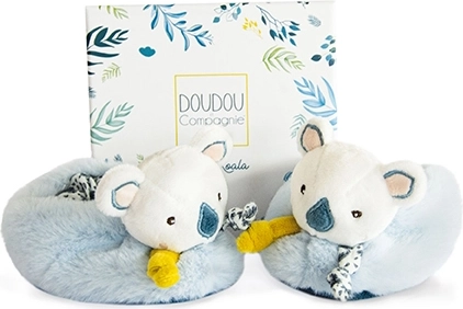 Ta darilni set vsebuje čudovite plišaste copatke z motivom koale Yoca, posebej oblikovane za novorojenčke, stare 0-6 mesecev. Copatki imajo vgrajene ropotuljice, ki ne le da ohranjajo stopala topla, temveč tudi spodbujajo grobo motoriko otroka in zabavo.