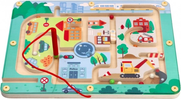 Odkrijte zabaven svet z Magnetnim labirintom Vozila, ki je zasnovan tako, da spodbuja razmišljanje in spretnost majhnih rok. Ta igrača je izdelana iz kakovostnega lesa in prikazuje pisano mestno sceno s cestami, stavbami in vozili. S pomočjo rdeče magnetne palice otroci vodijo majhne kroglice po poti, kar krepi njihove ročne spretnosti in koordinacijo roka-oko.