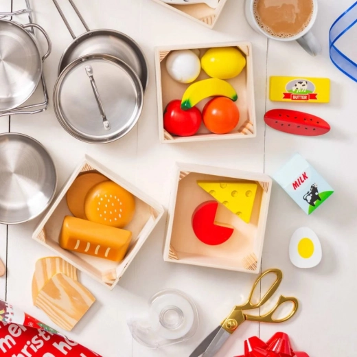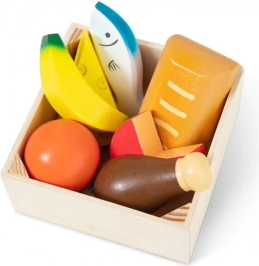 Ta leseni set živil vključuje štiri majhne škatle, ki skrivajo različna živila kot so mleko, sir, in kruh. Namenjen je za kreativno igro, ki pomaga otrokom razvijati fino motoriko in domišljijo.