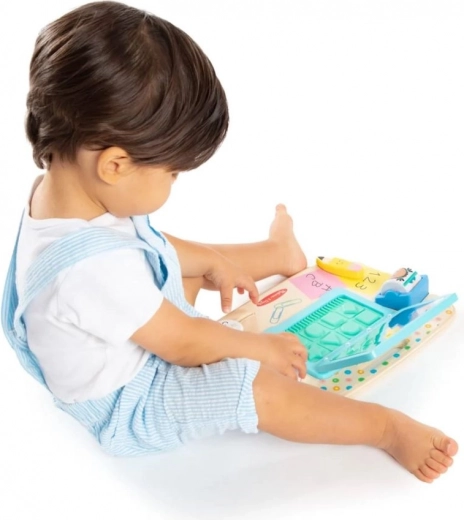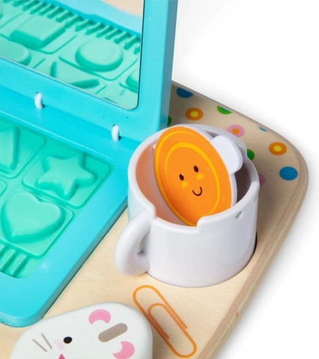 Leseni prenosnik vsebuje oblike in črke, ki podpirajo ustvarjalno igro in interaktivno učenje, kar je idealno za majhne otroke.