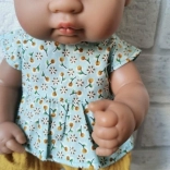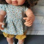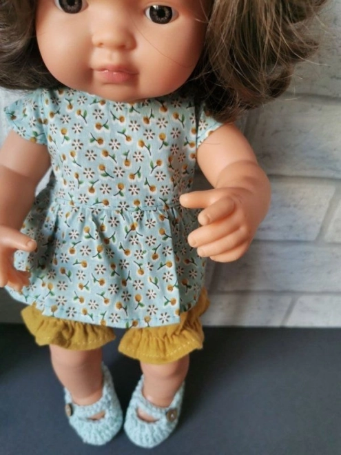 Stajliš musetlinski komplet za punčke velikosti 38 cm znamke Mirabelki, sešit v Poljski. Nežen material je prijeten na dotik in enostaven za vzdrževanje. Lahko ga likate pri nizki temperaturi, idealno je osvežiti s paro, da musetlin ohrani svojo strukturo. Primerno za otroke od 3 let, z izjavo o skladnosti CE za varno igro.