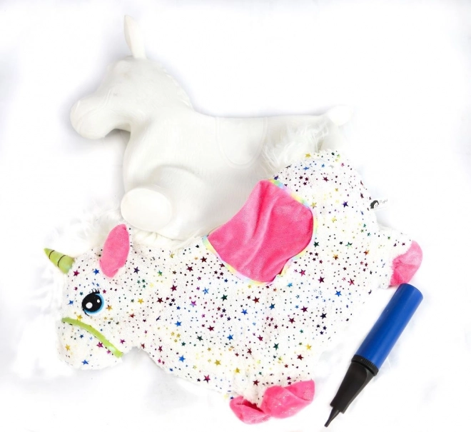 Skakajočega samoroga preprosto napihnete s priloženo ročno tlačilko. V hipu pripravljen za igro – prožno jedro, udoben oprijem in mere 60 × 50 × 25 cm.