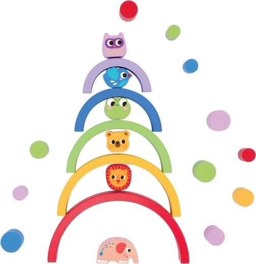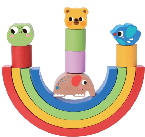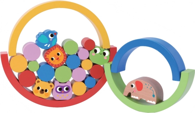 Ta vsestranska lesena sestavljanka ponuja neskončne možnosti igre. Otroci lahko iz barvitih lokov gradijo stolpe, mostove in steze, preizkušajo ravnotežje z živalicami ter vadijo zbranost. Kombinacija mavričnih polkrogov in figuric razvija ustvarjalnost ter uči logičnega razmišljanja in prostorske predstavljivosti.