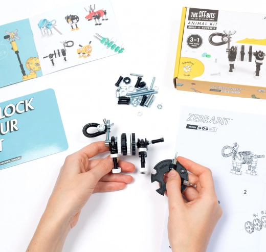 Stavebnica The OffBits ZebraBit je stilski in drzen komplet, poln vijakov, matic in oblikovanih delov, s katerim bodo otroci in odrasli uživali v ogromno ustvarjalne zabave. Sestavite ZebraBit, PoodleBit, CooperBit in druge edinstvene stvaritve po lastni domišljiji.