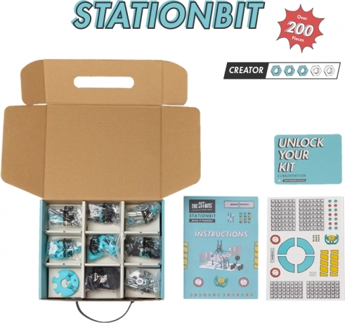 OffBits StationBit: kreativen STEM gradbeni komplet z več kot 200 deli, 3 modeli in embalažo kot igralnim modulom. Razvija domišljijo in fino motoriko. Za otroke 8+.