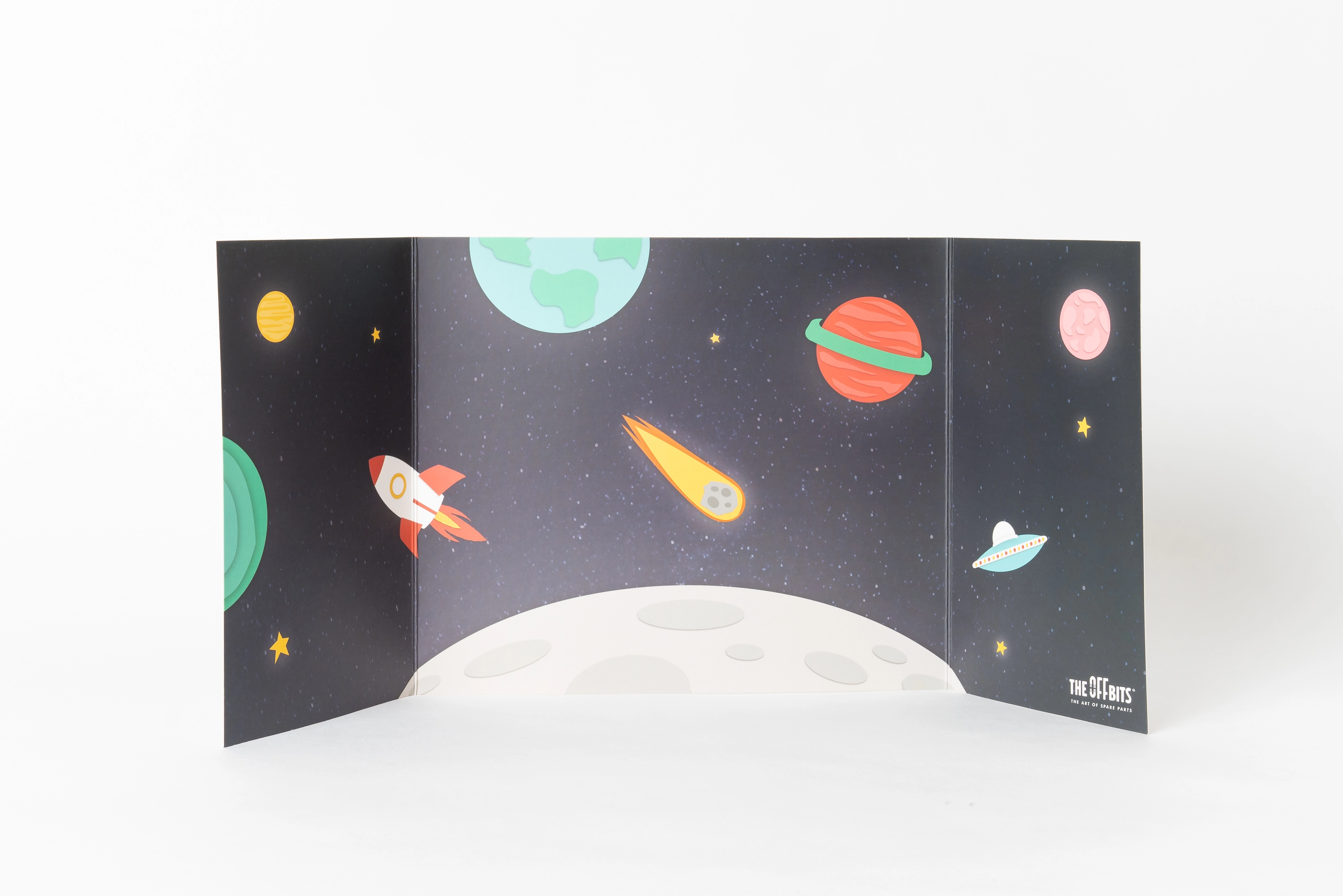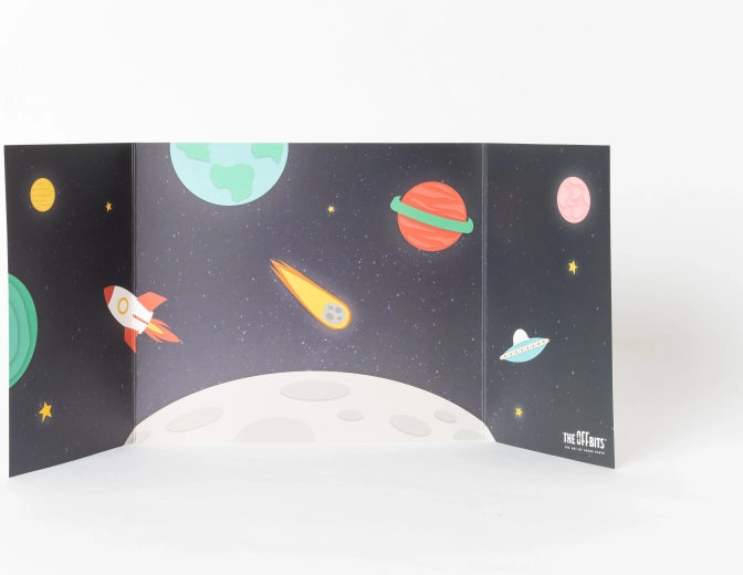Zložljivo kartonasto ozadje z vesoljskim motivom ustvari impresivno okolje za igro in fotografiranje končanih modelov. Stabilna tripanelna konstrukcija razširi igralni svet.
