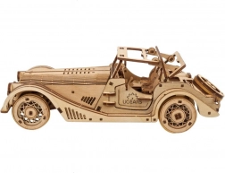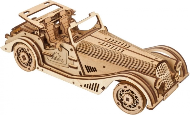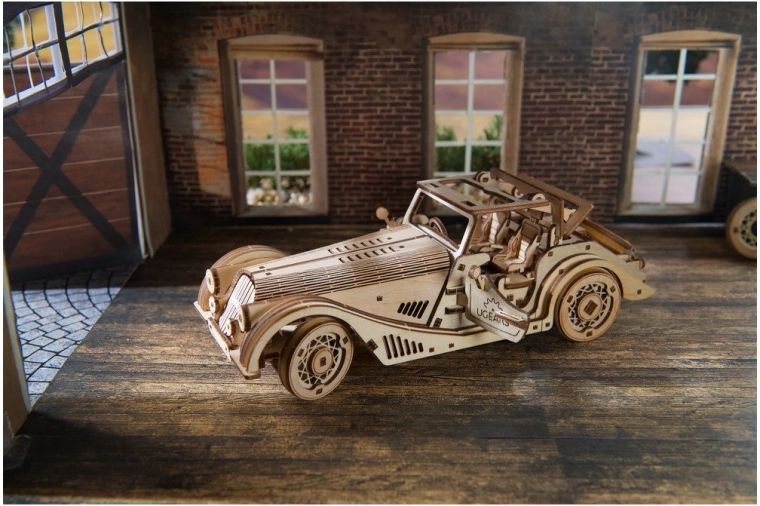 Model izstopa z detajlno notranjostjo, odpirajočimi se stranskimi vrati, ročno upravljano fiksno streho s strešnim oknom ter delujočim rezervnim kolesom v prtljažniku. V paketu je vse potrebno – deli so predrezani, sestavite pa jih po ilustriranih navodilih v 11 jezikih. Pustite naravni videz lesa ali vozilo pobarvajte po svoji domišljiji.