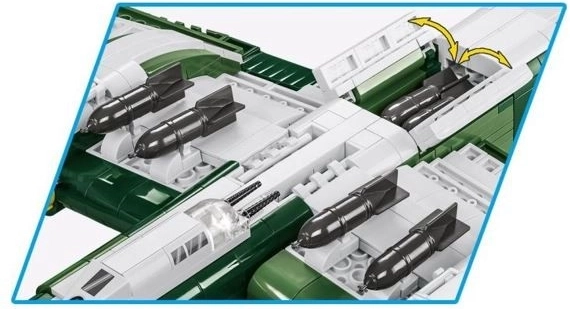 Komplet vsebuje 1160 kosov z odpornimi potiski (brez nalepk), na novo zasnovane elemente za realistično kabino, odpirajoče se bombnice, snemljive bombe in funkcionalno podvozje. V kokpitu je prostor za figurico pilota (priložena). Intuitiven slikovni priročnik zagotavlja tekočo gradnjo.