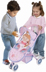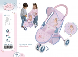 Prisrčen rožnobelo obarvan voziček za punčke GALA izstopa z modernim športnim videzom ter lahko konstrukcijo iz kovine in plastike. Z višino do ročaja 55 cm je idealen za mlajše otroke od 3 let. Vrtljivo sprednje dvojno kolo omogoča gladko vožnjo skozi zavoje, tritočkovni pas pa punčko varno drži na mestu.
