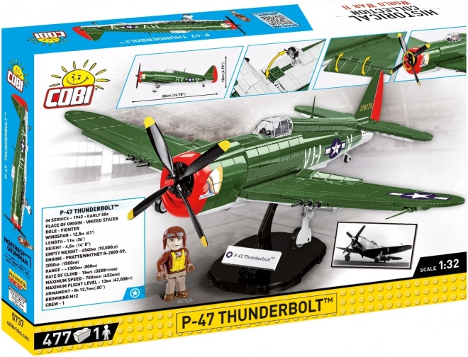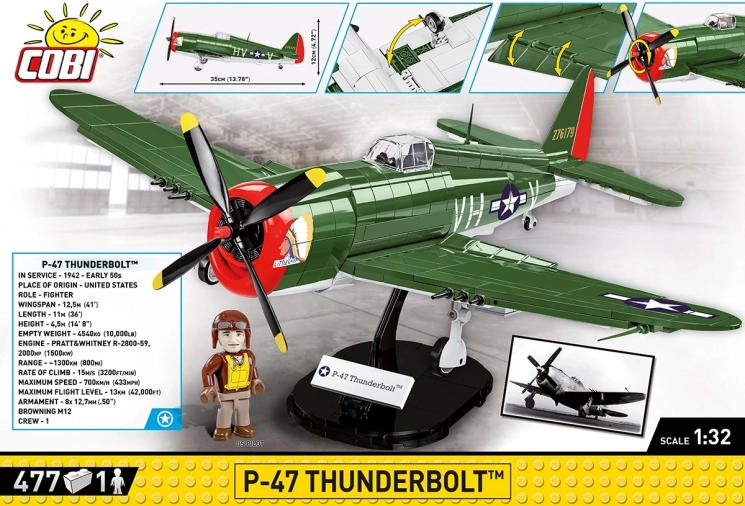 Sestavite legendarno ameriško lovsko letalo P-47 THUNDERBOLT v merilu 1:32 iz 477 kakovostnih kock COBI. Model ponuja trpežne potiske brez nalepk, premične elemente (kolesa, propeler, krilca), figurico pilota in prezentačno stojalo z imensko tablico. Idealno za ljubitelje zgodovine, letalstva in zbiratelje.