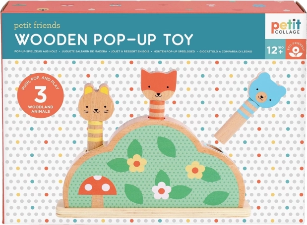 Odkrijte igrivo in varno zabavo za najmlajše z leseno izstrelitveno igračo PETIT COLLAGE. Tri gozdne živalice na vzmeteh čakajo, da jih otroci pritisnejo in spustijo, da poskočijo – odlična aktivnost za razvoj fine motorike, koordincije oko–roka in razumevanja vzroka in posledice. Izdelana iz FSC® certificiranega lesa, natisnjena z netoksičnimi vodnimi barvami in pakirana v okolju prijazni embalaži.