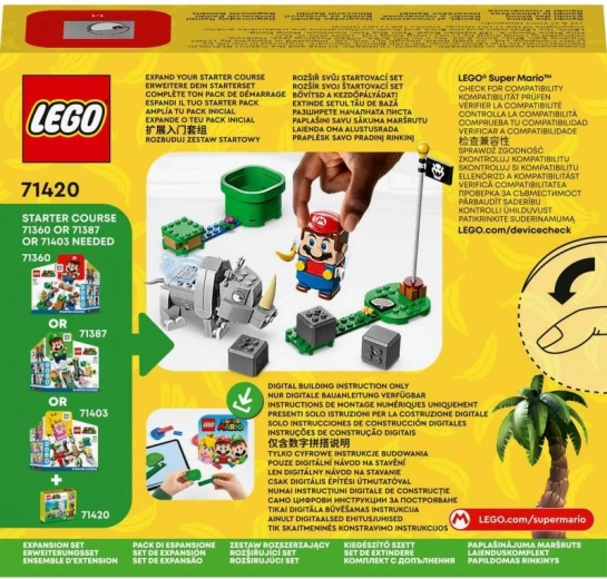 Razširite svoje pustolovščine z LEGO Super Mario in se podajte v akcijo z razširitvenim kompletom Nosorog Rambi. Ta komplet vključuje figuro Rambija, na kateri lahko interaktivne figure LEGO Mario, LEGO Luigi ali LEGO Peach (niso priložene) jezdijo in odkrivajo skrivališča z bananami.