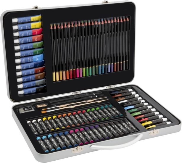 Odlična izbira za umetnike, ta set likovnih pripomočkov je shranjen v elegantnem kovinskem kovčku, ki vsebuje vse, kar potrebujete za svojo ustvarjalnost na poti.