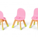 Stolčki imajo rožnata sedala in lahke lesene noge z neon rumenimi konicami, popolni za otroke.