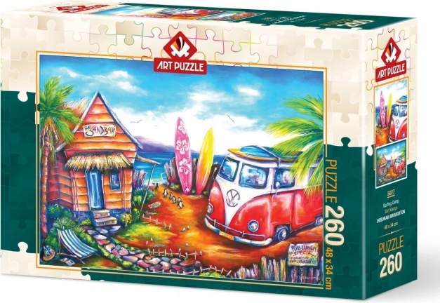 Odkrijte sproščeno vzdušje poletnega dne ob morju s sestavljanko Surf kamp. Puzzle ART PUZZLE s 260 kosi so idealna izbira za trenutke sprostitve in družinskega sestavljanja, ko si zbistrite misli in se razveselite končne slike velikosti približno 48 × 34 cm.