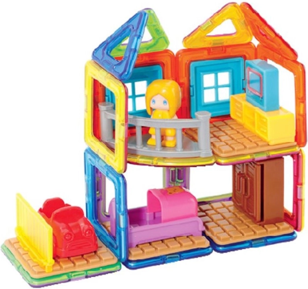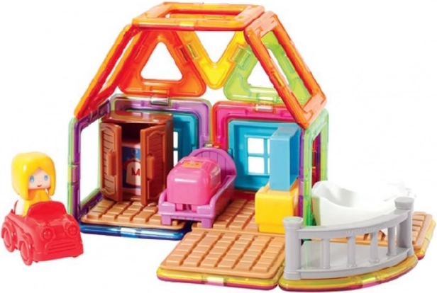 Spoznajte Magdo in si oglejte njeno hišico. Kreativna magnetna sestavljanka omogoča sestavljanje velikega števila tridimenzionalnih objektov s pomočjo dvodimenzionalnih plastičnih mnogokotnikov. Magformers razvija fino motoriko, spodbuja ustvarjalnost, uči otroke barve in osnovne geometrijske like. Dimenzije delov in premišljeno izbrane oblike zagotavljajo največjo možno varnost igrače. Material, iz katerega je sestavljanka izdelana, izpolnjuje najstrožja higienska in zdravstvena merila. Deli so dovolj veliki, ni jih mogoče pogoltniti in so praktično nelomljivi. Vsebina pakiranja: