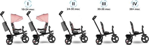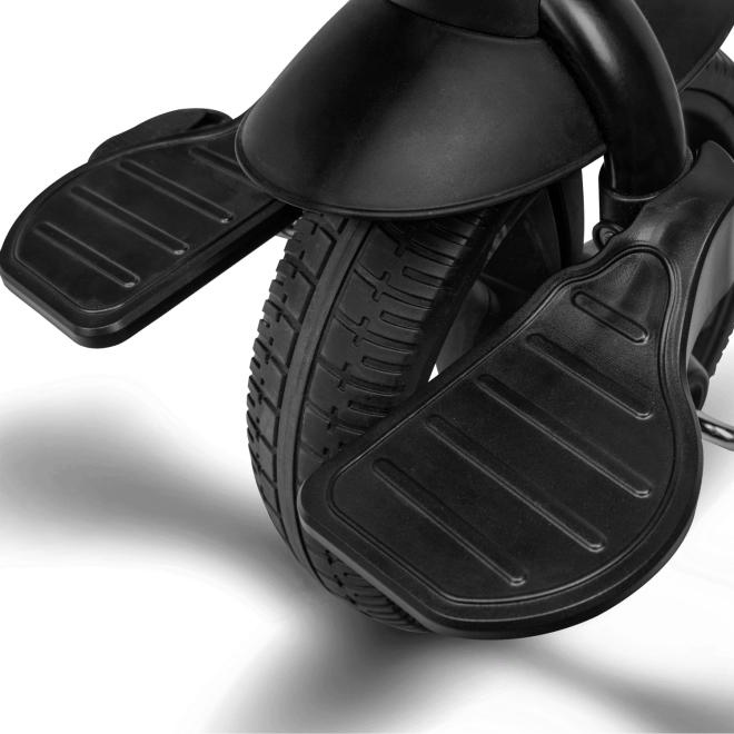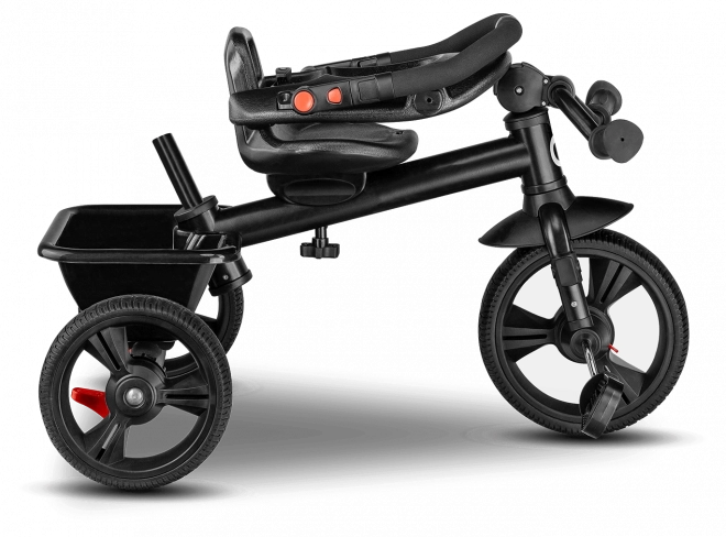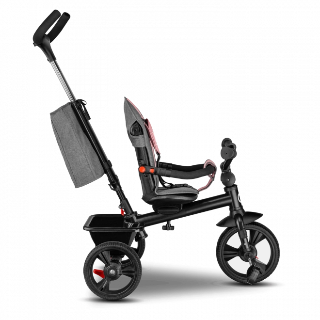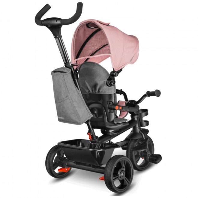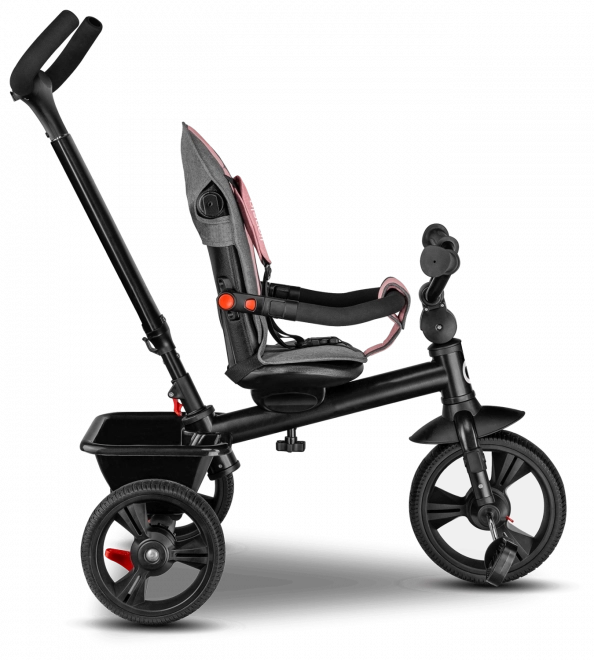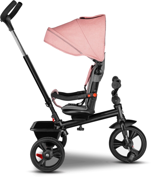 Za maksimalno udobje so tu nastavljiva strešica s prozornim okencem, nastavljiv ročaj za starše in praktična oprema – košara, torba in držalo za steklenico. Varnost povečujejo 3-točkovni pasovi, varovalni lok, odsevni elementi in dva neodvisna zadnja zavorna mehanizma. Tricikel se preprosto zloži v kompaktno velikost, po zložitvi pa ga je mogoče udobno prenašati zahvaljujoč integriranemu ročaju.