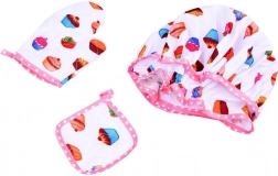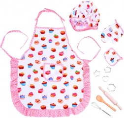 Ta popoln komplet za male kuharje je idealen za prvo peko piškotov in igro slaščičarja. Lahek predpasnik z veselimi motivi kolačkov ščiti oblačila, medtem ko kapica in rokavica otrokom pričarata občutek profesionalnosti. Zahvaljujoč realnim pripomočkom, kot so lesena žlica, valjar, metlica in kovinski modelčki, si otroci lahko varno preizkusijo osnovne kuharske veščine.
