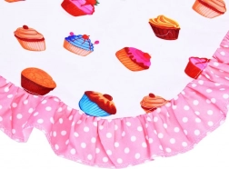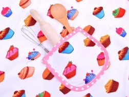 Predpasnik in dodatki z barvitim vzorcem kolačkov ter rožnatimi volančki ščitijo oblačila in kuharskim dogodivščinam dodajo zabaven slog.