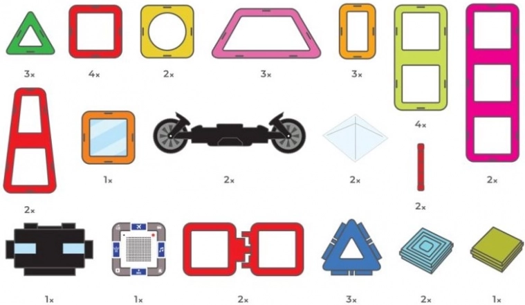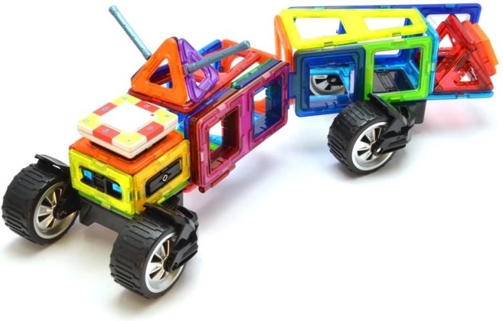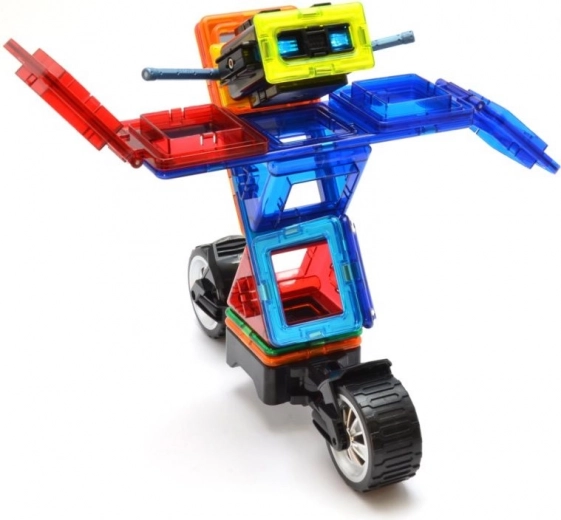 Box je idealen za gradnjo premičnih robotov s prosto nastavljivimi rokami, pa tudi motociklov, tovornjakov in prikolic. Trije tristranski nastavki in bogat nabor pravokotnikov pomagajo ustvarjati čvrste ogrodja po višini in dolžini. Otroci bodo preizkusili delo z magnetnimi spoji, razvijali domišljijo, prostorsko predstavo in fino motoriko. Deli so varni, trpežni in združljivi z GEOMAG.