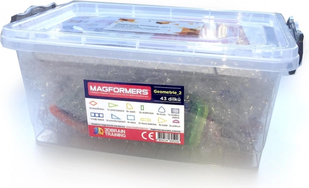Komplet Magformers Geometrija: Ravnina in Prostor vsebuje 43 delov za razvoj geometrije in matematične predopismenjenosti v osnovni šoli. Namenjen je otrokom v 3. do 5. razredu in razvija njihovo znanje 2D in 3D geometrije.