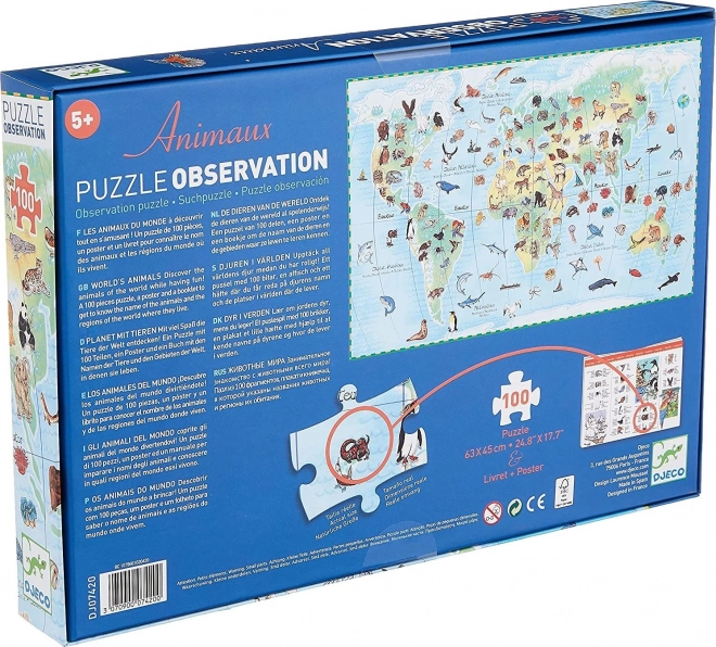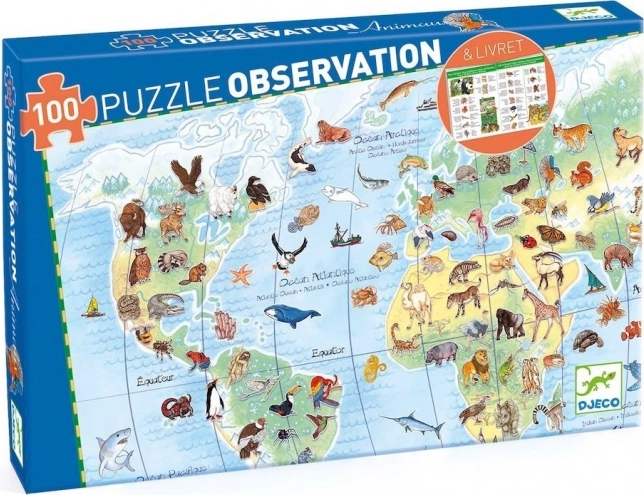 Odkrijte svet z otroško sestavljanko DJECO Observation, ki združuje veselje do sestavljanja z raziskovanjem narave. Na veliki ilustraciji bodo otroci našli živali z vseh celin, priložena brošura pa jim bo razširila znanje. Sestavljanka s 100 kosi meri po sestavi približno 63 × 45 cm in spodbuja logično razmišljanje, potrpežljivost in fino motoriko.