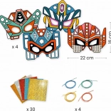 Vsebuje vse potrebno: 4 predizrezane maske s samolepilnimi območji, 30 listov s kovinskimi detajli, 4 elastike in jasna navodila korak za korakom. Odlično za organizirano ustvarjanje na zabavah, v krožkih ali za skupno družinsko popoldne.