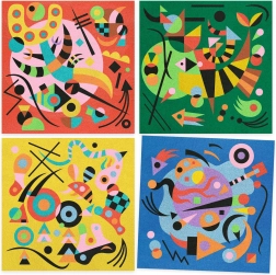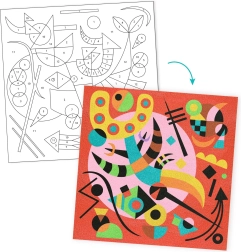 Ta ustvarjalni set prinaša zabavo in izobraževanje v enem paketu. Vsebuje štiri ilustrirane kartice, ki jih lahko otroci okrasijo z dvanajstimi barvnimi peski. Set prihaja s plastičnim orodjem in podrobno brošuro, ki nudi korak za korakom vodnik za ustvarjanje. Otroci se učijo o delih in tehnikah Wassilyja Kandinskyja, ne da bi naredili nered, saj delajo v zaprti škatli, kar pomaga ohraniti pesek na mestu.