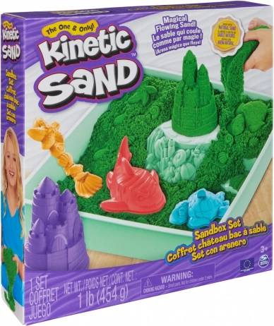 V kompletu je 454 g zelenega peska, modelčki za morske živali in grad ter lopatka za kopanje, zajemanje in sipanje. Pesek je izdelan iz naravnega peska in je odlična alternativa plastelinu – spodbuja fine motorične spretnosti, kreativnost in samostojno igro.
