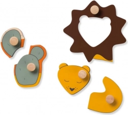 Lesena sestavljanka Hauck Lion je zasnovana za varno in veselo prvo sestavljanje. Barvni koščki z živalmi in sončkom imajo praktične ročaje, ki otrokom olajšajo rokovanje, okrepijo oprijem in jih naučijo pravilno vstavljati oblike na njihova mesta.