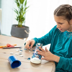 Pri sestavljanju si otroci urijo potrpežljivost, logično razmišljanje in fino motoriko. Končana teniska se spremeni v stojalo za svinčnike, barvice in škarje, zato veselje nad izdelkom ostane prisotno vsak dan.