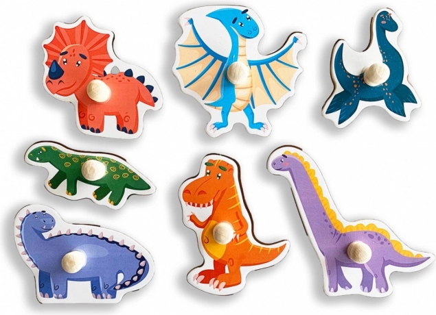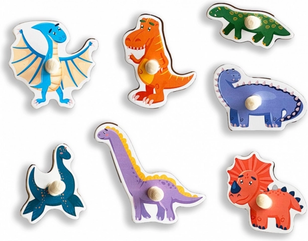 Barvita lesena sestavljanka z dinozavri za najmlajše podpira fino motoriko, koordinacijo oko–roka in prepoznavanje oblik in barv. Sedem koščkov s praktičnimi ročaji se vstavi v natančno izrezane odprtine na plošči, kar olajša rokovanje ter razvija logično mišljenje in vizualni spomin.
