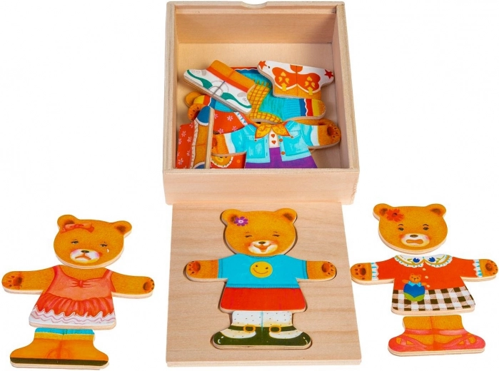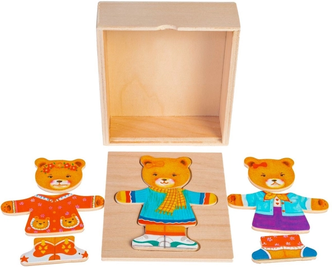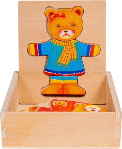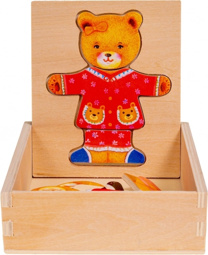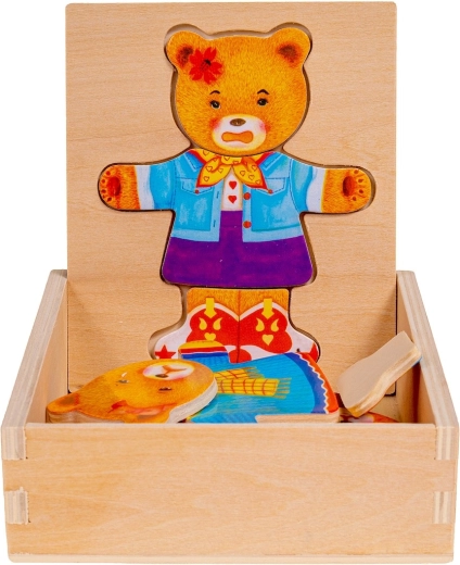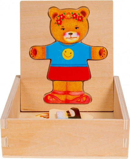 Lesena sestavljanka Medvedek punčka je vesela igrača, ki pomaga razvijati otroško domišljijo. Skupaj 18 delov je mogoče shraniti na posebej oblikovanem mestu na pokrovu škatle ali na drugi površini.