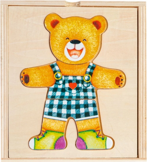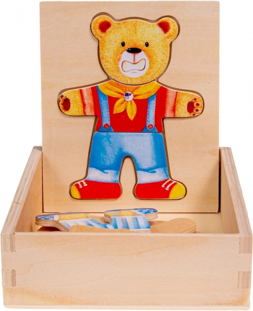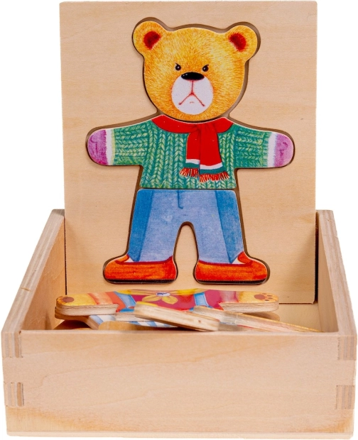 Lesena sestavljanka Medvedek ponuja zabavno igro za otroke, ki spodbuja razvoj koordinacije in finih motoričnih sposobnosti. Otroci lahko spreminjajo razpoloženje ali oblačila medvedka s pomočjo različnih sestavljank.