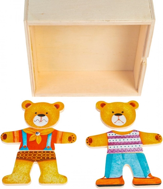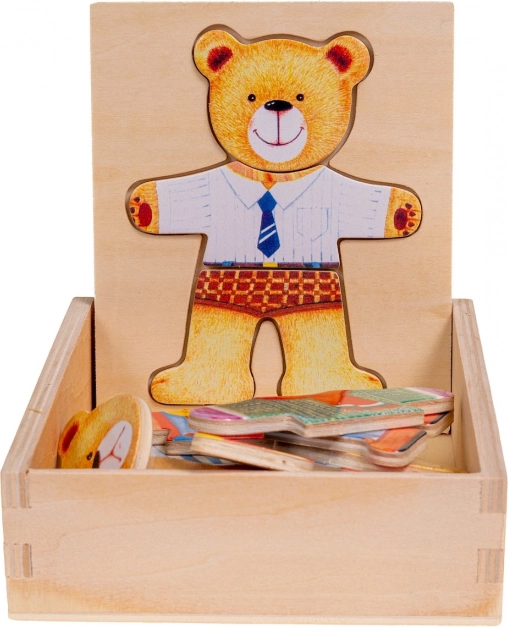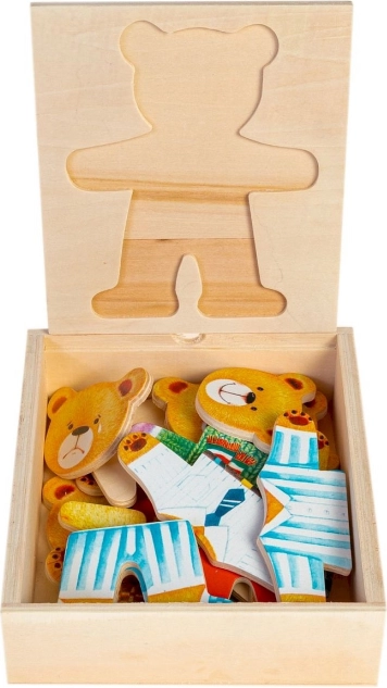 Lesena sestavljanka z motivom medvedka je zabavna igrača za otroke. Zaradi različnih izrezov lahko medvedka oblečete ali spremenite njegovo razpoloženje, kar bo otrokom zagotovo všeč. Vsi deli se udobno prilegajo v leseno škatlo, ki služi tudi kot podlaga za sestavljanje.