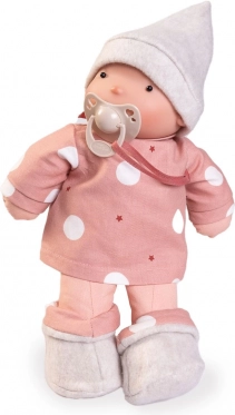 Ta nežna punčka je zasnovana posebej za dojenčke in malčke. Združuje okolju prijazne materiale z varno izdelavo: telo in okončine iz organskega bombaža, realistična glavica iz 100 % silikona ter polnilo iz mehkega recikliranega PET vlakna. Del kompleta je magnetska duda iz bio organskih materialov z naravnimi pigmenti.