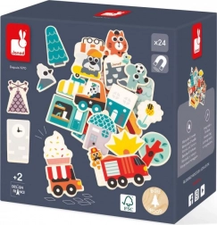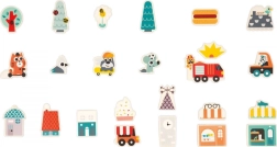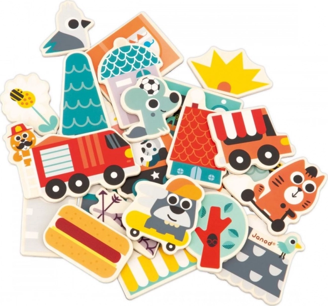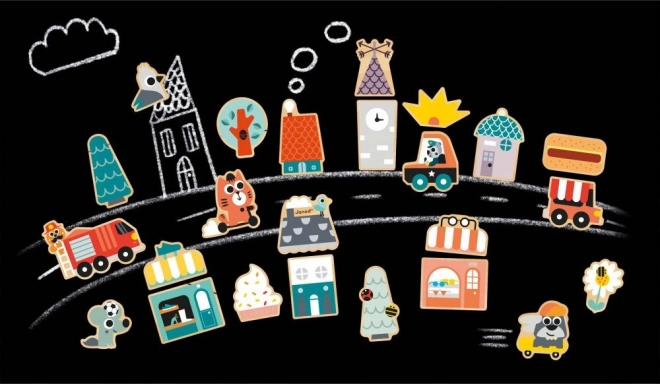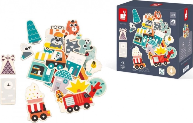 S tem kompletom 24 lesenih magnetov lahko ustvarjate na vseh magnetnih površinah! Komplet otroških magnetkov poleg skiroja in rolke vsebuje tudi magnetke z vozili (gasilski avto, policijski avto, vozilo s hrano) ter elemente, potrebne za sestavljanje trgovin, hiš in vsega, kar je potrebno, da to mesto, naseljeno z veselimi živalmi, zaživi in zacveti. Magnetke lahko med seboj kombinirate in tako ustvarite številne različne kombinacije.