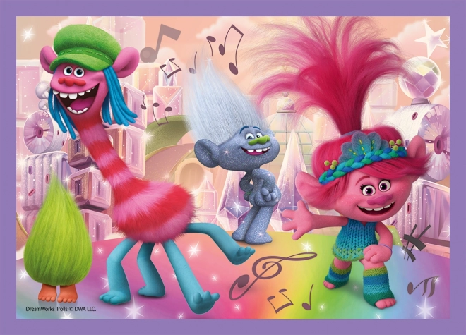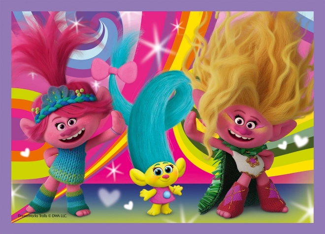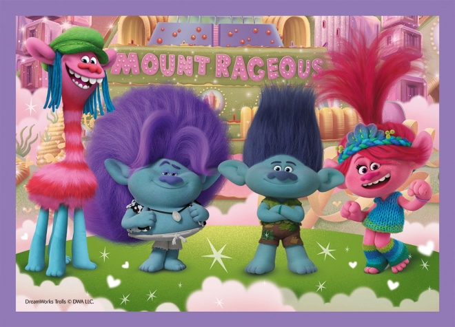 Odkrijte veselje do sestavljanja z barvitimi junaki iz filma Troli. Ta set 4v1 združuje štiri samostojne slike z naraščajočim številom koščkov, zato je odlična izbira za otroke, ki se učijo in postopoma izpopolnjujejo svoje veščine. Vsaka sestavljanka po sestavi meri približno 28,5 × 20,5 cm.
