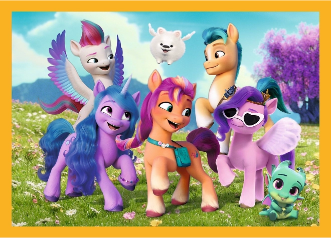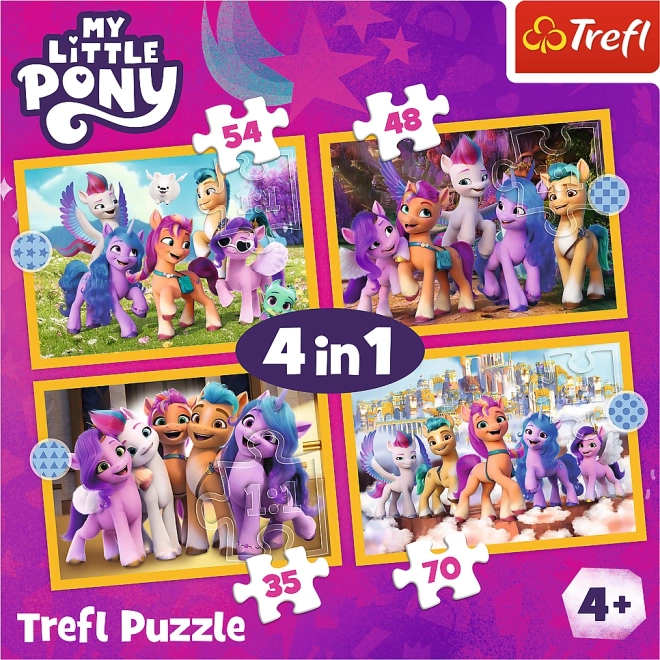 Barvit komplet 4 v 1 sestavljank z motivi MY LITTLE PONY bo razveselil male ljubitelje zlagank. Štiri samostojne slike velikosti 285 × 205 mm in različno število kosov (35, 48, 54, 70) prinašajo zabavo in postopni izziv. Izdelano na Poljskem iz okolju prijaznih materialov, primerno za otroke od 4 let.