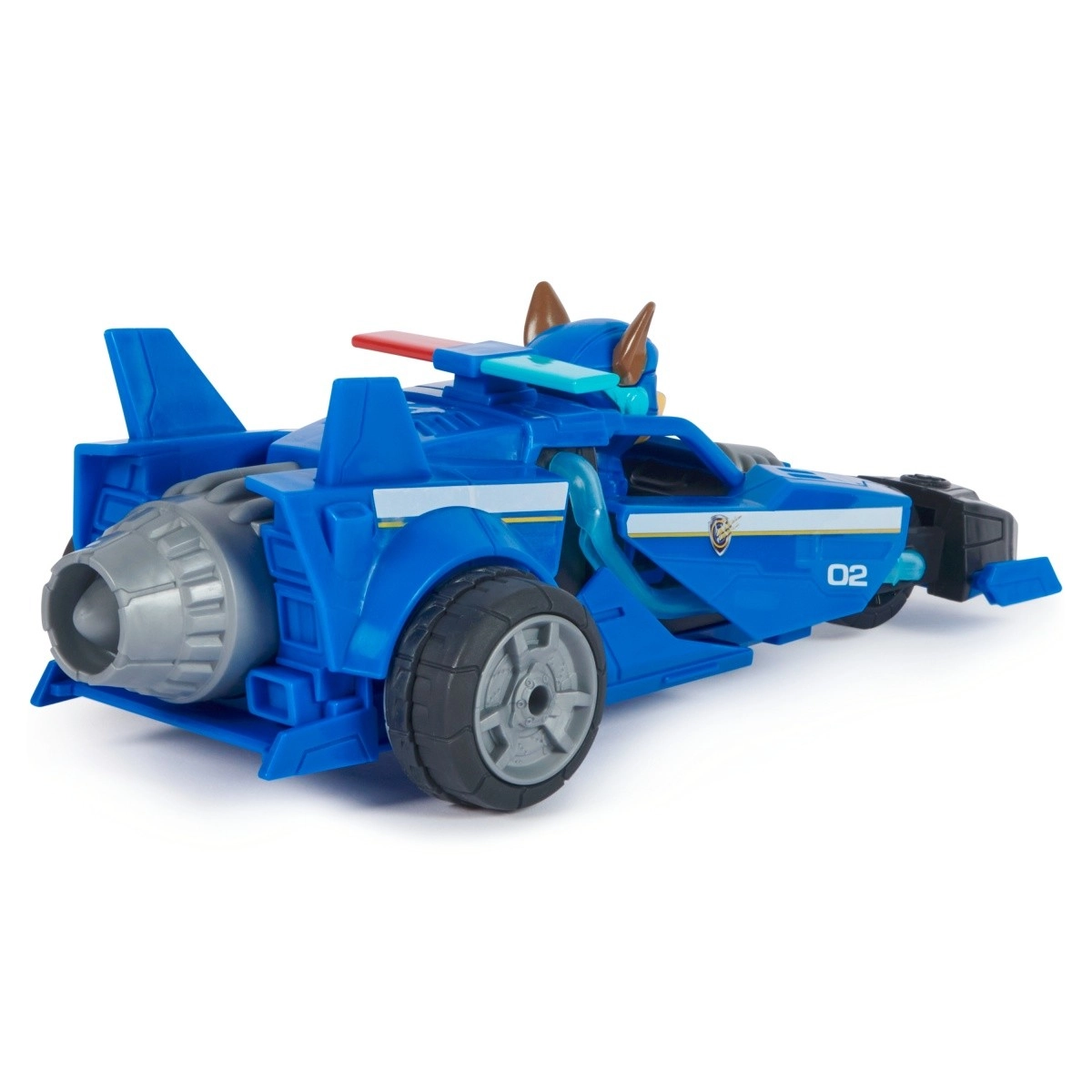 Podroben policijski avto s številko 02, aerodinamičnimi elementi in figurico Chase – prav tak kot v Tačkah na patrulji: Velikem filmu.