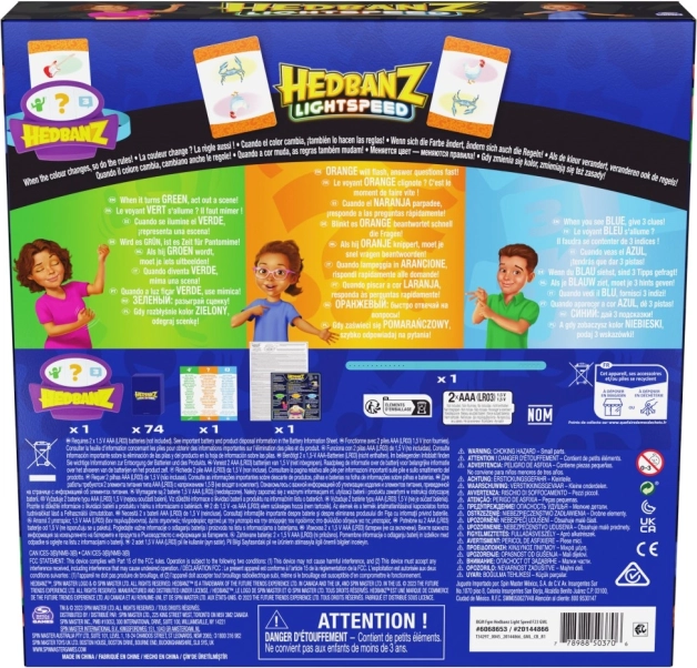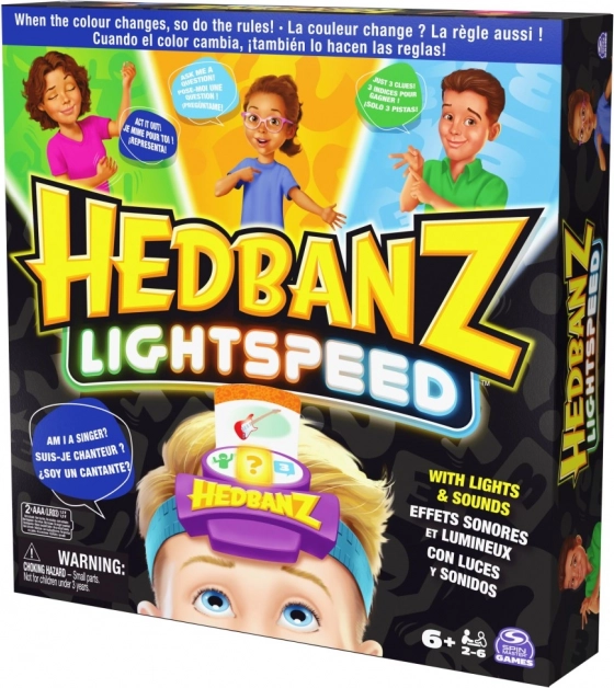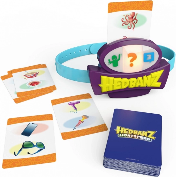 Uživajte v vznemirljivi igri Hedbanz Lightspeed, kjer se pravila nenehno spreminjajo zaradi dinamične elektronske čelade s tremi barvami. Predstavljajte si prizor, odgovorite s svetlobno hitrostjo ali uporabite tri namige glede na barvo, ki jo čelada trenutno prikazuje.