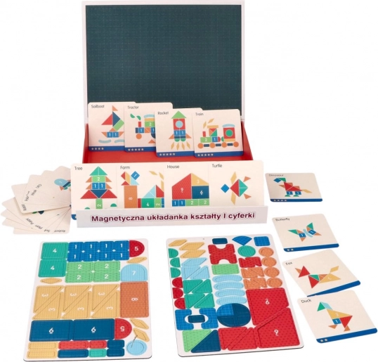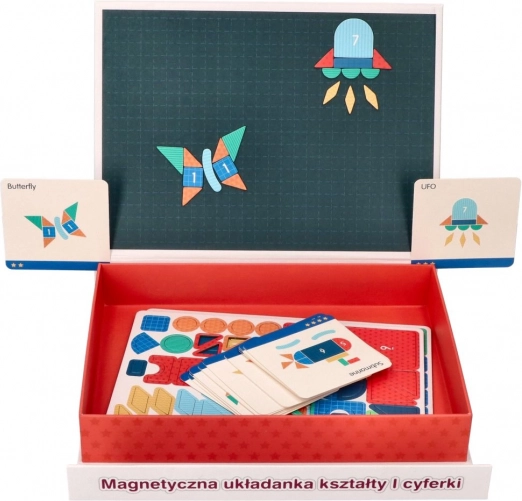 Praktična magnetna sestavljanka v obliki zložljive table skriva kar 109 magnetnih elementov, s katerimi si bodo otroci na igriv način urili oblike in številke. V kompletu so tabla z linijami, 20 barvnih kart z vzorci ter množica koščkov različnih velikosti in oblik za neskončne možnosti sestavljanja doma in na poti.