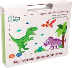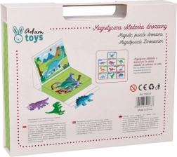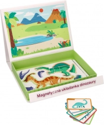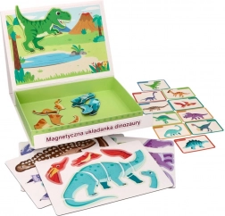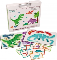 Vsebina pakiranja: magnetna tabla 26 × 19 cm, 10 barvnih kartic z ilustracijami in imeni dinozavrov ter 51 magnetnih koščkov za sestavljanje. Izdelek je iz varnih materialov in izpolnjuje standarde CE.