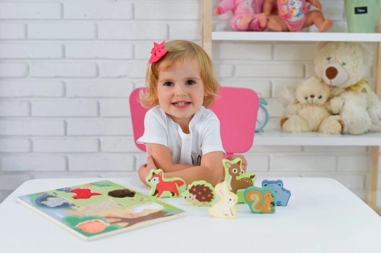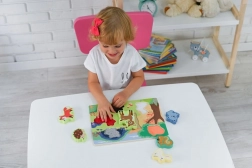 Zaradi odporne lakirane površine in gladkih robov je igrača primerna za vsakodnevno igro. Spodbuja koordinacijo oko–roka, potrpežljivost in zbranost, pri tem pa otroci naravno spoznavajo živali iz gozda.