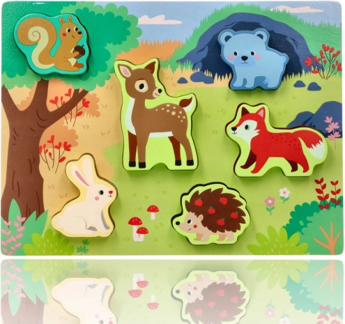 Ta kakovostna lesena vstavljanka z motivom gozdnih živali je zasnovana tako, da malčke pritegne z barvami in oblikami ter jih varno spremlja pri prvih korakih odkrivanja. Debelejši 3D koščki dobro ležijo v roki in se zlahka vstavljajo v izreze na podlagi.