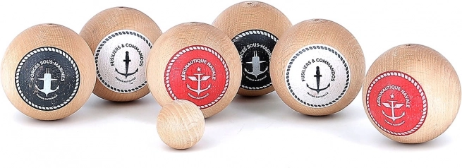 Stilski komplet za tradicionalno igro pétanque v dizajnu, navdihnjenem s francosko mornarico. Vsebuje 6 igralnih krogel, ciljno kroglico in priročno tekstilno vrečko. Izdelano iz masivnega lakiranega lesa, okolju prijazno in trajnostno. Idealno za 2–6 igralcev, primerno od 5 let naprej, izdelano v Franciji.