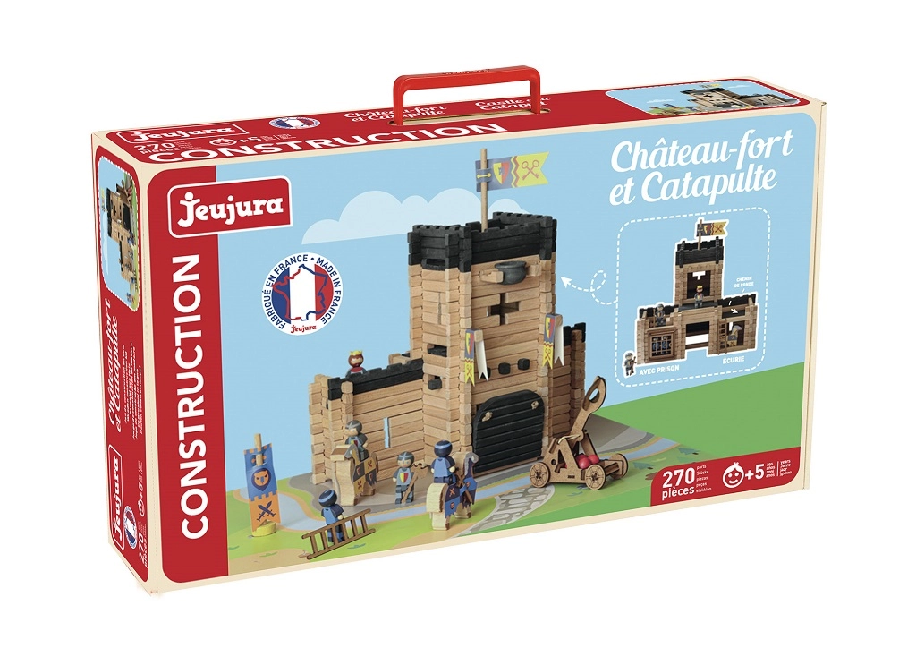 Zgradite svoje srednjeveško kraljestvo z leseno sestavljanko JEUJURA. Set s 270 deli iz masivnega lesa omogoča otrokom, da ustvarijo velik grad s premičnim mostom, ječo, stražnimi potmi, zastavami in delujočim katapultom. Tradicionalna francoska izdelava, varna barvila na vodni osnovi in praktična embalaža v kartonastem kovčku naredijo ta set popolno darilo za male graditelje od 5 let naprej.