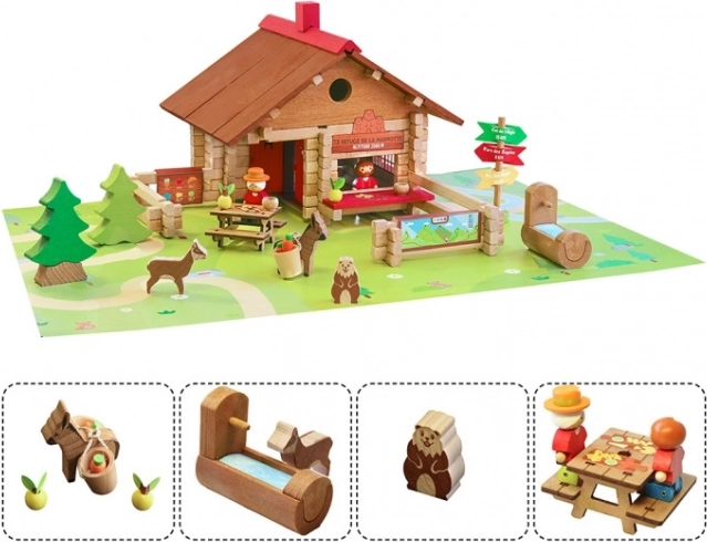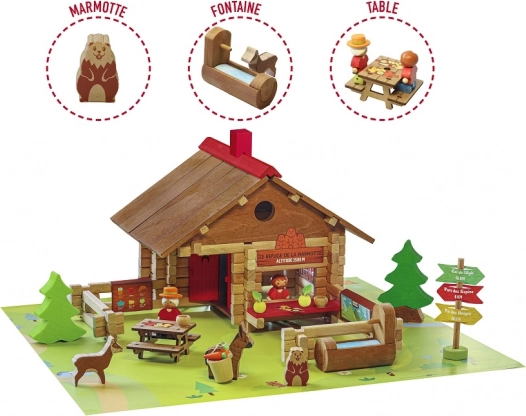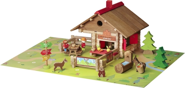 Ta pristna lesena sestavljanka iz serije Jeujura otrokom približa svet gorskih koč in živalskih prijateljev. Deli iz masivnega bukovega in borovega lesa francoskega porekla se zlahka spajajo in omogočajo gradnjo stabilnih hišk z realističnimi detajli. Priloženi so tudi tematski dodatki – piknik miza, fontana in figurice (npr. osel, gams in svizec), ki spodbujajo domišljijo in pripovedno igro.