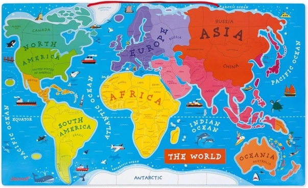 Magnetni zemljevid sveta je odlično izobraževalno orodje za otroke, ki jim pomaga na igriv način spoznavati geografijo. Vsebuje 92 koščkov, ki predstavljajo različne regije in države.