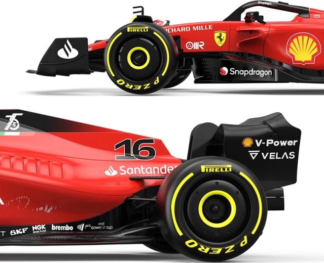 Zvesto oblikovana karoserija z nalepkami sponzorjev in ikoničnim rdečim lakom FERRARI ga naredi za privlačen zbirateljski kos in odlično igračo.